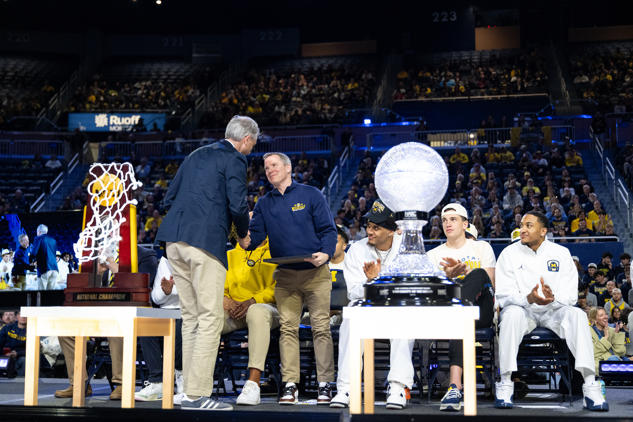 Each year, the NCAA Division I men’s basketball national champion is awarded the iconic NABC National Championship Trophy. The one-of-a-kind Waterford Crystal trophy is presented to the winning head coach following the Division I National Championship Game. Each national champion proudly displays the NABC National Championship Trophy on campus as a reminder of its place in college basketball history.